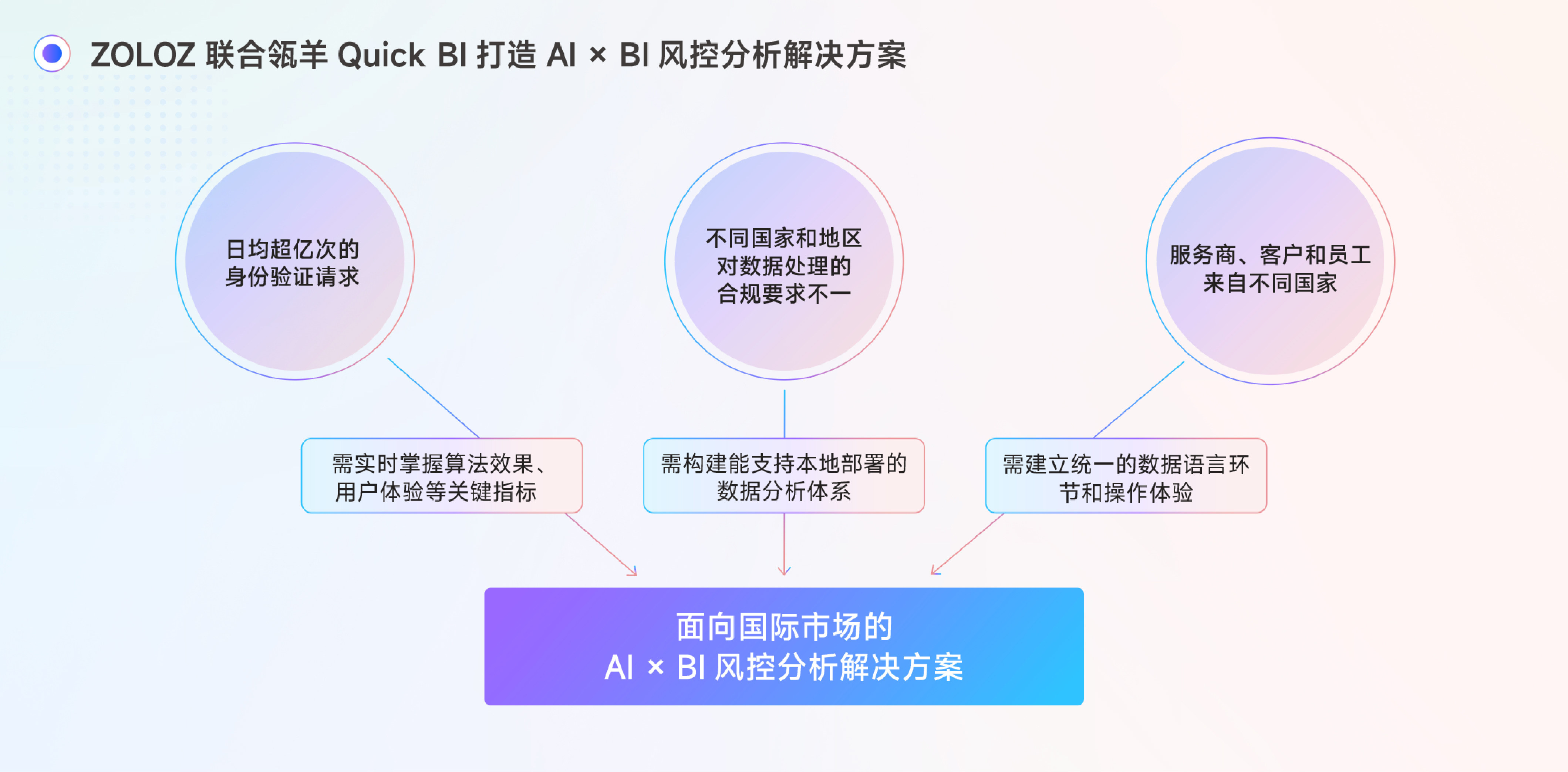 为解决上述痛点,ZOLOZ联合瓴羊Quick BI,借助其全球化部署能力与灵活高效的数据分析平台,快速构建全球一致性强、合规性高、体验友好的数据分析体系。共同打造一套面向国际市场的 AI × BI 风控分析解决方案,以智能化的数据分析能力,为全球跨境交易提供强有力的风控支持。