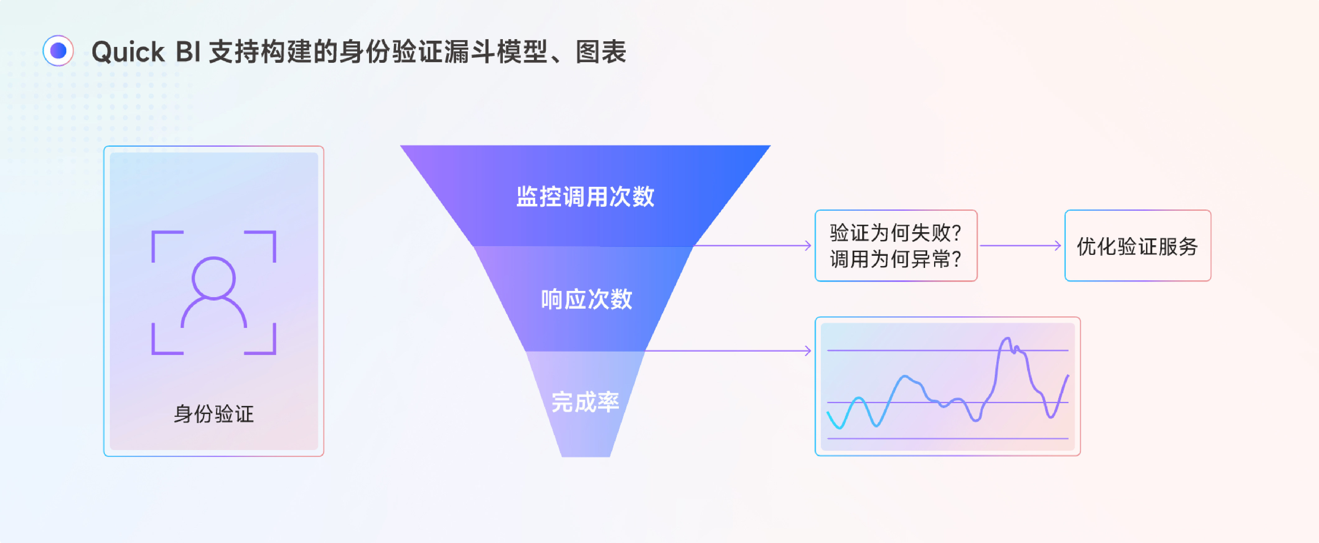 以身份验证业务为例,Quick BI发挥了关键作用:它支持构建漏斗模型(监控调用-响应-完成率),以评估服务整体表现;通过分析调用量与成功率趋势图,迅速定位波动及异常原因;结合失败状态与日志码进行深度分析,可精准追踪诸如网络延迟、转人工比等影响服务的关键节点,精准定位问题源;从而为研发和运营团队提供坚实的数据依据,指引服务优化与迭代方向,高效制定优化策略。